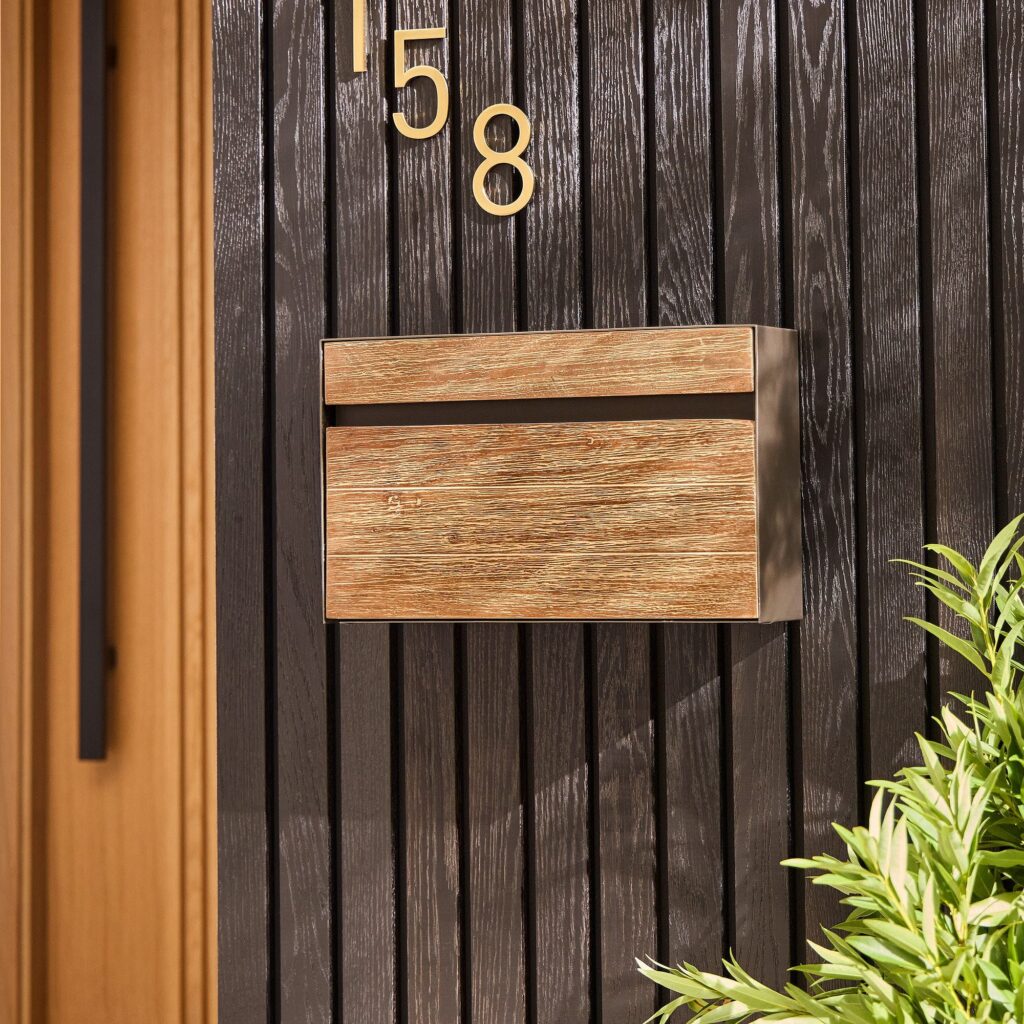 Mounting the box just next to the gate or on a side wall ensures privacy while still being easily accessible for delivery. The design is simple, letting the beautiful wood gate take the focus.