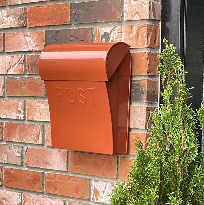 Talk about a warm welcome! This charming mailbox has a soft, rounded shape and a delightful rusty orange or copper tone, featuring the word “POST” embossed right on the front. It’s mounted on a classic red brick wall.