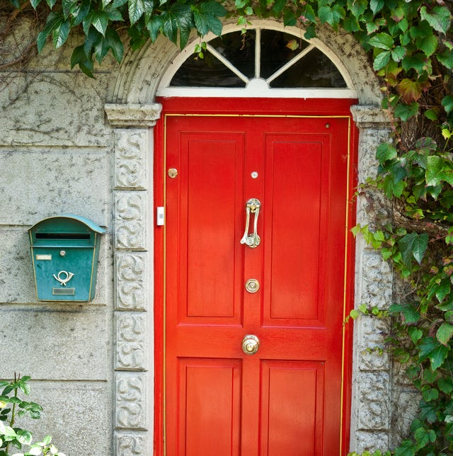 Oh my goodness, this one gave me all the European cottage vibes! It’s a beautiful, aged teal green mailbox mounted on a charming stone wall right next to a bright red door framed with crawling ivy.