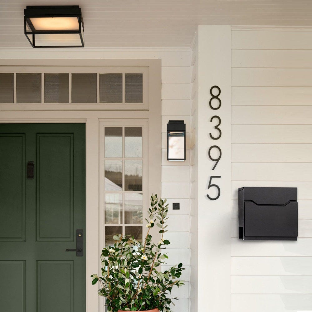 The vertical orientation of the numbers really draws the eye up and makes the entryway feel taller and more grand. The black elements against the white siding and the dark green door create an incredibly sharp, fresh look.