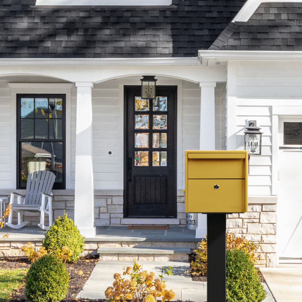 The white makes the mailbox stand out beautifully without competing with the vibrant door color. It’s a very traditional shape, making it approachable and timeless.