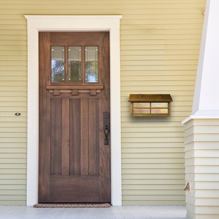 This is such a unique and thoughtful design, echoing the architectural style of the home itself. It’s a brass-toned mailbox with small, stained-glass windows, perfectly complementing the detailed windows on the adjacent dark wood door.