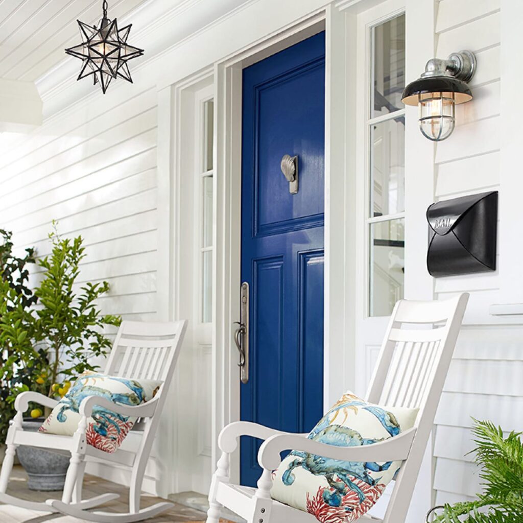 The simple curve is elegant and functional, and the word “MAIL” is subtly embossed on the side. It perfectly complements the gorgeous blue front door and the relaxed, coastal feel of the rocking chairs on the porch.