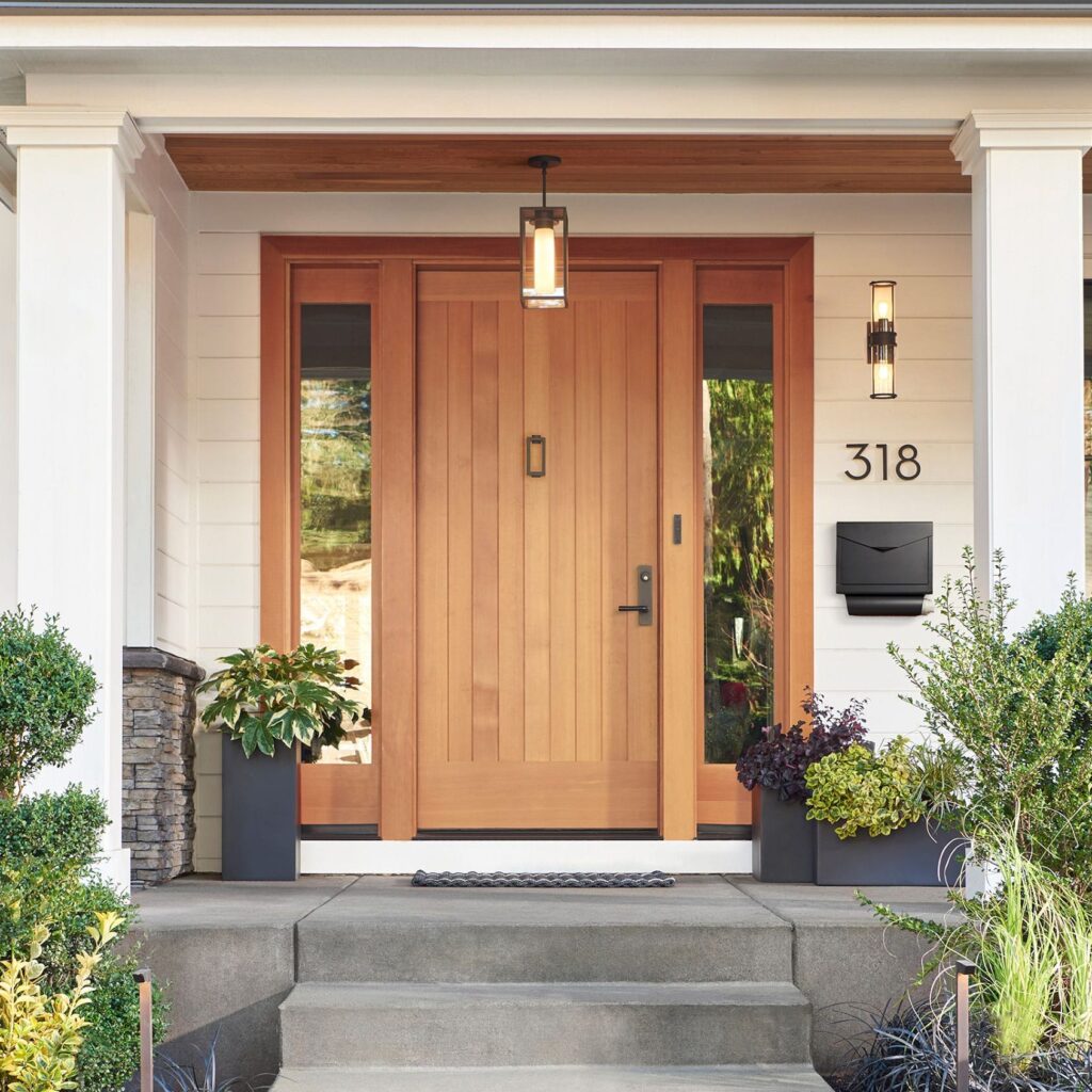 The subtle shine of the brass house numbers above complements the wood tones beautifully, tying the whole look together. This would be fantastic if you have a mid-century modern home or simply want to soften a darker exterior palette.
