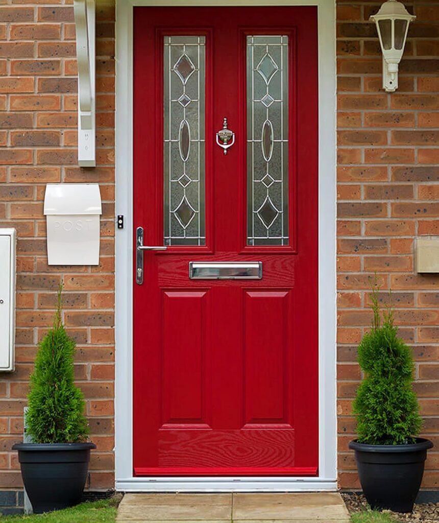 The simple, clean lines of the white box feel fresh and light, contrasting beautifully with the deep red door and the rustic brick exterior. The word “POST” is faintly visible, giving it a subtle detail.
