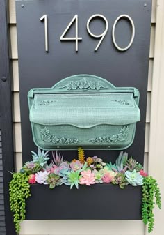 It’s mounted on a black panel, which provides a striking, modern backdrop that makes the mailbox’s lovely curves and color stand out even more. But the real showstopper is the overflowing planter of colorful, faux succulents right underneath. The mix of pinks, yellows, and deep greens is so playful and vibrant!