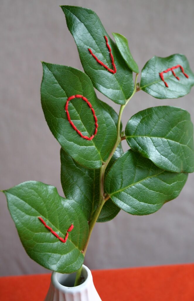 A fresh branch of waxy green leaves becomes a living canvas for bright red embroidery thread. Each leaf features a single letter carefully stitched into the surface to spell out a message of love. The vibrant red yarn pops beautifully against the natural deep green of the foliage, blending the organic with the handmade.