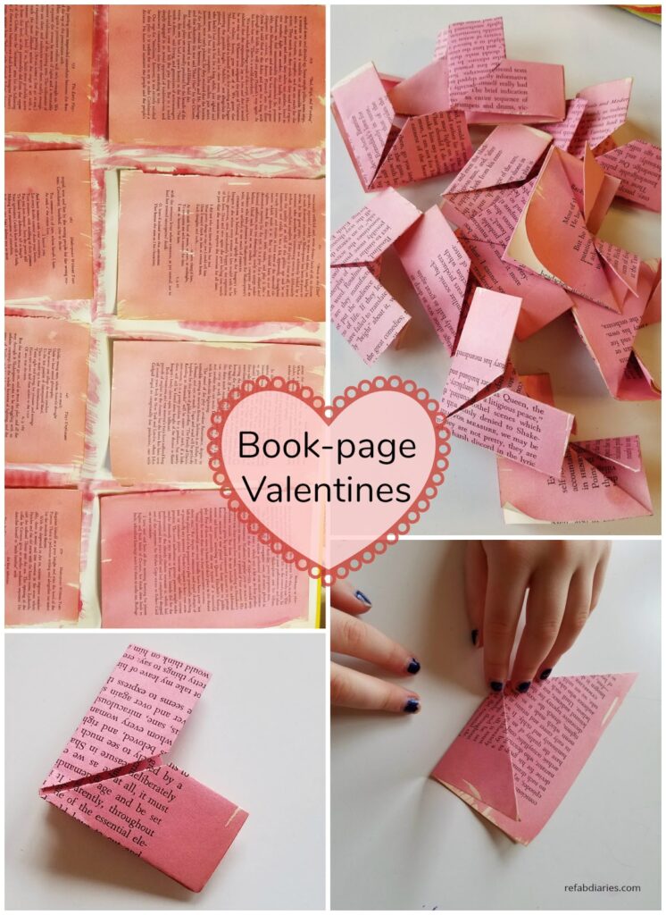 Old book pages are given a new architectural form through a series of precise folds that create a classic heart shape. Some pages are dyed with a soft pink wash to add a layer of romantic color while keeping the original text visible. These folded pieces have a beautiful 3D quality that makes them feel much more substantial than a flat card.