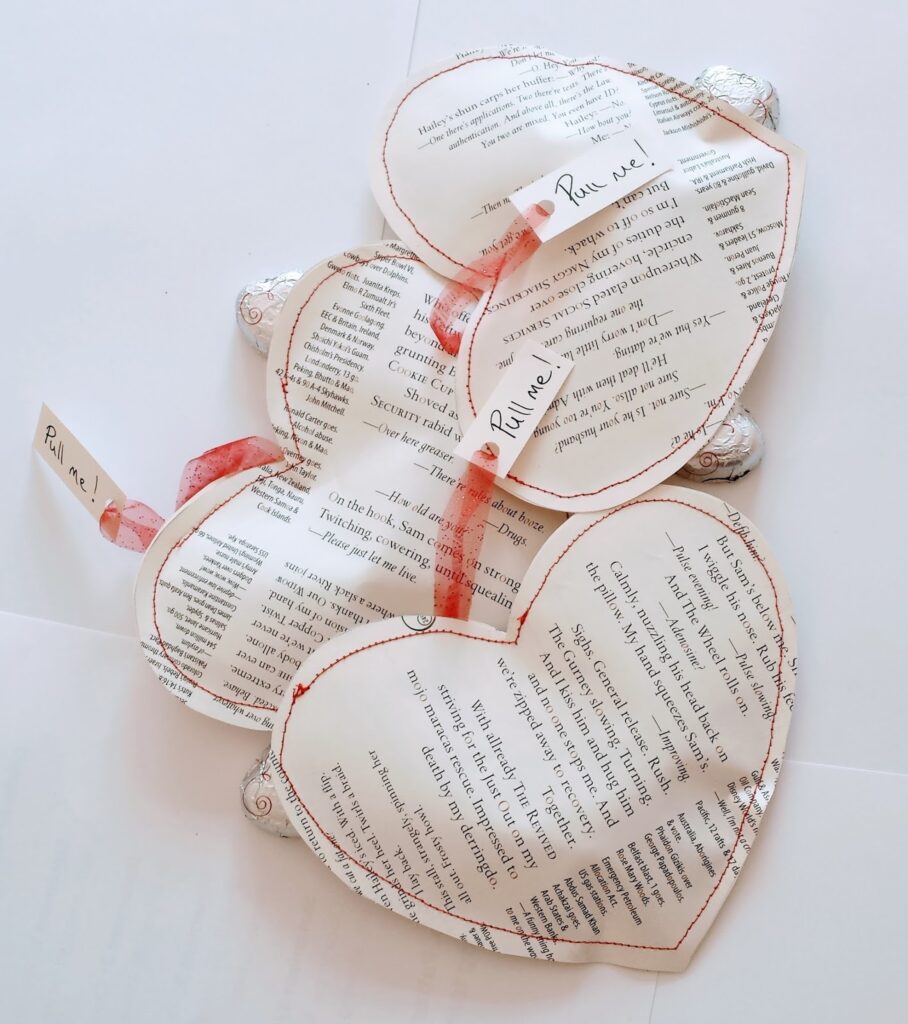 Delicate hearts cut from vintage book pages are brought to life with a simple red stitched border around the edges. Each paper pouch is filled with a small treat and features a tiny tag that says “Pull me!” for a whimsical interactive element.