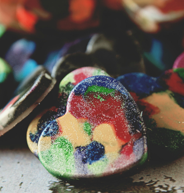 Melted remnants of old, broken crayons are transformed into chunky heart-shaped blocks of swirling color. Each heart is a kaleidoscope of blues, greens, and oranges, finished with a light dusting of silver glitter for extra sparkle. These recycled gems are thick and tactile, making them perfect for little hands or as a fun desktop accessory.