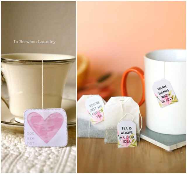 Standard tea bags are given a thoughtful makeover with custom paper tags featuring sweet phrases and watercolor heart designs. One tag reads “You are hot” while others offer cozy sentiments like “Warm hands, warm hearts” or “Tea is always a good idea.” The soft pinks and floral patterns turn a morning routine into a moment of intentional self-care or a sweet surprise for a partner.