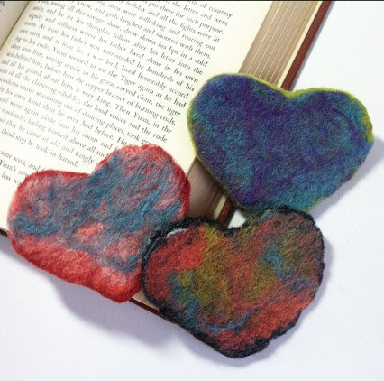 These soft, fuzzy hearts are made from needle-felted wool in a beautiful array of sunset tones and deep purples. The fibers are blended together to create a mottled, organic look that feels incredibly warm and tactile. Resting against an open book, these hearts look like tiny, comforting pillows that invite you to reach out and touch them.
