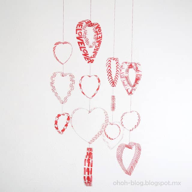 Simple strips of red and patterned washi tape are folded into heart shapes and suspended at different lengths from a central point. The various patterns, from stripes to florals, add a playful and eclectic feel to the minimalist white background. This display is incredibly light and airy, moving gently with the slightest draft in the room.
