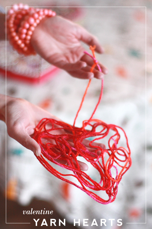 Bright red and orange yarn is soaked in stiffener and molded into airy, abstract heart shapes that hold their form once dry. The tangled, looping lines of the thread create a sense of messy, beautiful complexity that is very visually interesting. Held in a hand, these hearts look delicate and weightless, almost like a sketch brought into three dimensions.