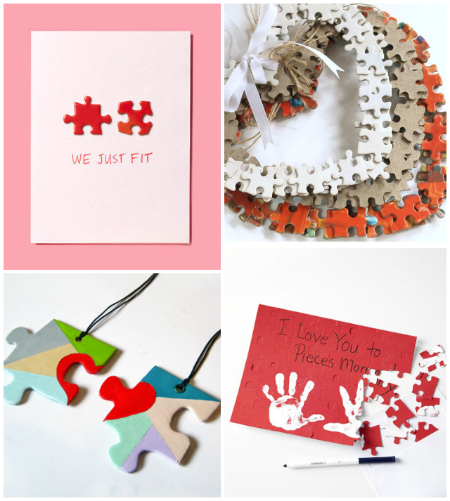 Mismatched puzzle pieces are given a new life as the stars of these adorable handmade cards and wreaths. Some are painted in bright reds and whites, while others are left in their original state to create a “We just fit” theme. The interlocking shapes are a perfect metaphor for connection and love, making them a very sweet choice for a personalized gift.