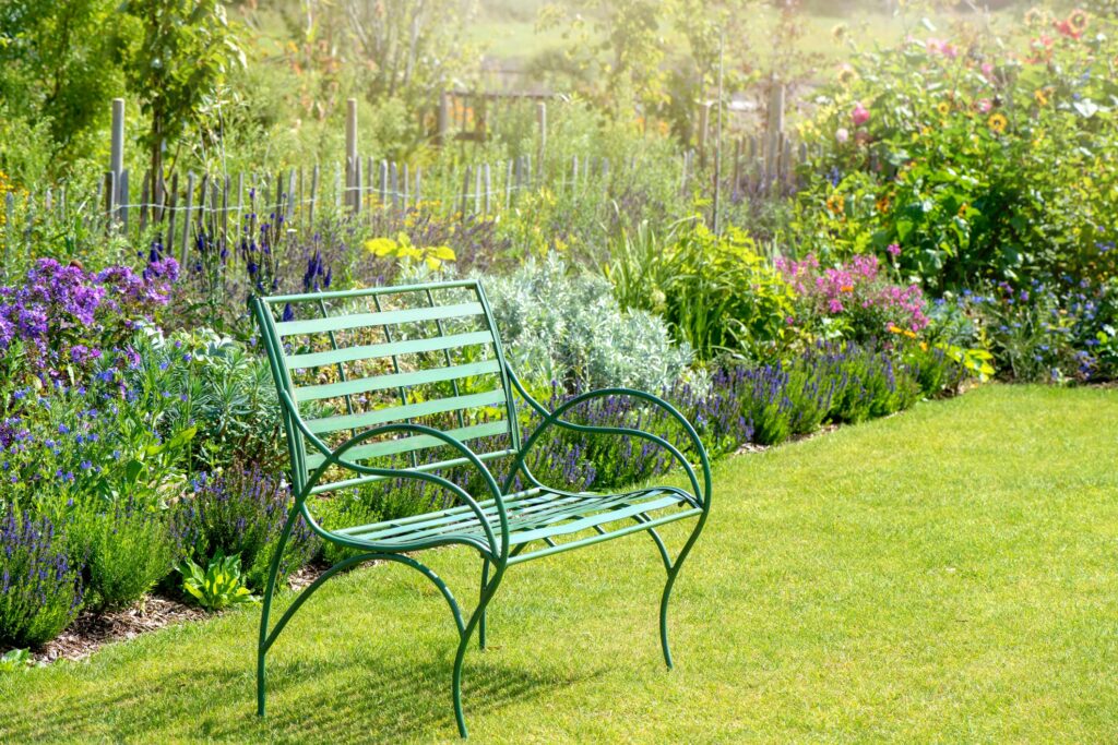 A simple, light green metal bench sits on a perfectly manicured lawn, backed by a tidy row of purple lavender and pink perennials. A rustic picket fence in the background adds a touch of farmhouse charm without feeling cluttered. This design works because of its clean lines and open space, allowing the colors of the flowers to be the main focus.