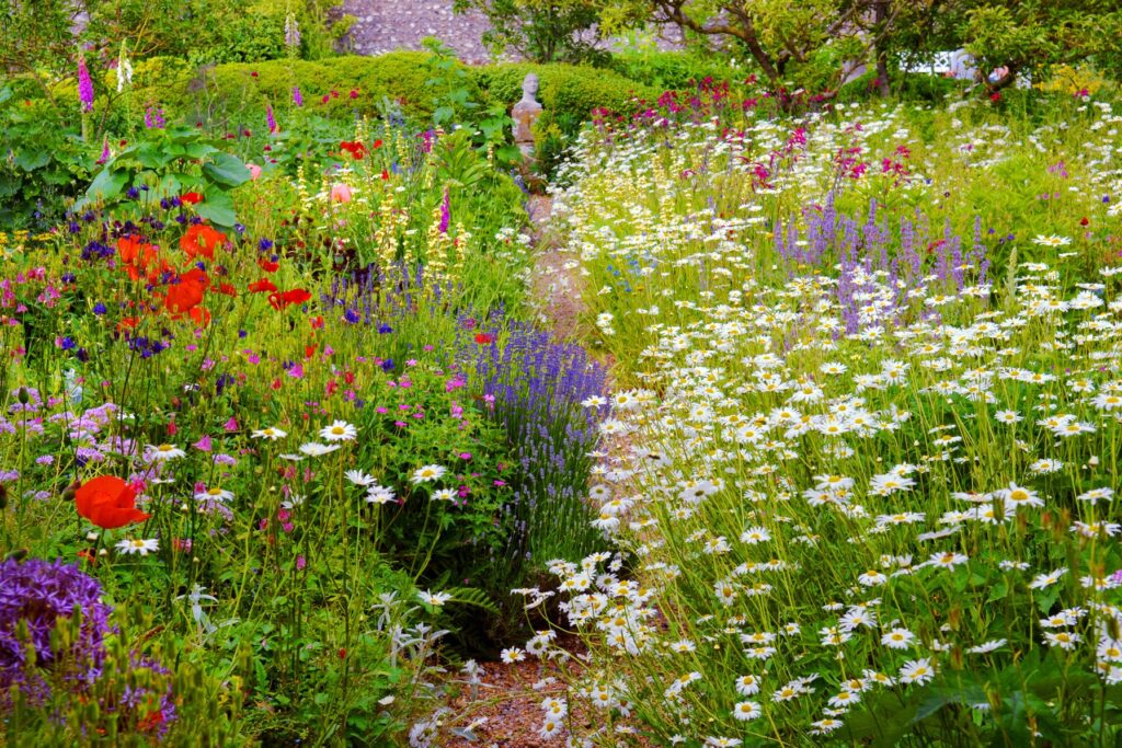 A vibrant explosion of color fills this space, featuring bright red poppies, tall purple alliums, and a sea of white daisies. A narrow dirt path cuts through the tall stalks, leading the eye toward a soft green hedge in the distance. This design works because it celebrates the natural, unrefined beauty of wildflowers rather than a manicured lawn.