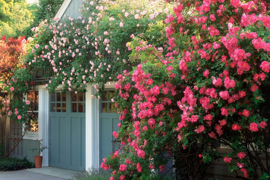 Massive clusters of vibrant pink and soft blush roses completely transform a simple blue-grey garage or garden shed. The roses are allowed to grow freely over the roofline and around the windows, creating a wall of living color. This design works by taking a functional building and turning it into a beautiful architectural feature of the landscape.