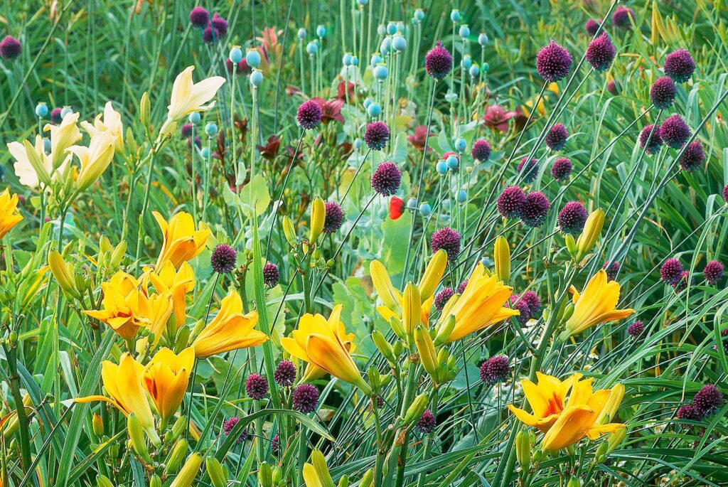This close-up view showcases the architectural beauty of tall purple alliums standing high above bright yellow daylilies. Scattered throughout are the unique, pale blue seed pods of poppies, adding a whimsical and textured element to the mix.