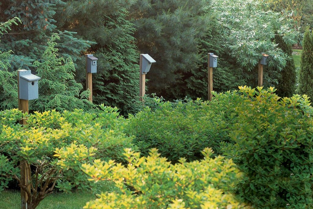 Five matching, pale blue birdhouses are mounted on tall wooden posts, standing in a neat line above a dense green hedge. Behind them, a variety of evergreen trees provides a thick, textured backdrop in shades of sage and emerald. This is a brilliant way to add a repetitive, whimsical element that also serves a functional purpose for local wildlife.