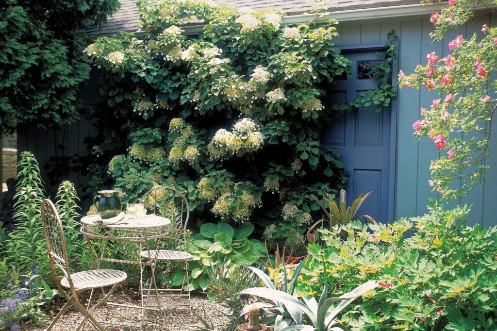 A charming blue door is nearly hidden by an enormous, flowering climbing hydrangea that spills across the wall. In the foreground, a delicate white bistro set sits on a gravel patio, surrounded by spiky agave plants and soft green hostas.
