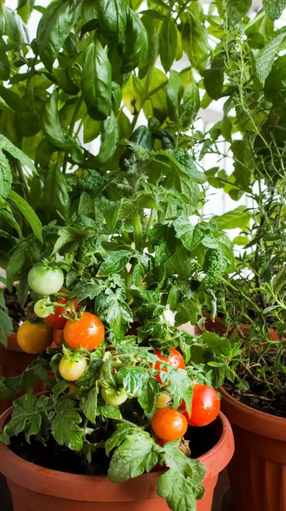 This image captures the quintessential container garden dream: a lush, thriving mix of cherry tomatoes and tall basil growing together in terra-cotta-colored pots. The vertical growth of the basil creates a stunning green backdrop, contrasting beautifully with the bright red and pale green of the ripening tomatoes. This combination works so well visually because the varying heights and textures add depth and richness, making the small space feel abundant and jungle-like. The scene radiates a warm, Italian-kitchen energy, inviting you to reach out and pick a few leaves for your next meal. It feels incredibly domestic and productive, instantly elevating a simple patio or window ledge into a culinary haven. To recreate this gorgeous vibe, choose determinate tomato varieties that stay compact and plant tall herbs like basil or rosemary just behind them in a slightly larger pot.