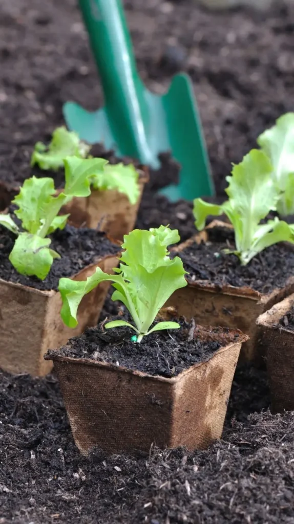 Here we see the beginning of a beautiful garden: small lettuce seedlings tucked into biodegradable peat pots, nestled in rich, dark soil with a mint green trowel nearby. The delicate, ruffled texture of the young lettuce leaves is highlighted against the deep brown earth, suggesting fresh growth and spring promise. This setup creates a feeling of hopeful anticipation and gentle care; it’s the quiet, meditative stage of gardening. The biodegradable pots are a thoughtful, simple design choice that emphasizes ease and sustainability, allowing you to transplant the entire thing later with minimal disturbance. A great tip for this stage is to use these small pots for starting seeds indoors 4 to 6 weeks before the last frost, giving them a head start before transferring them to larger bucket gardening containers.