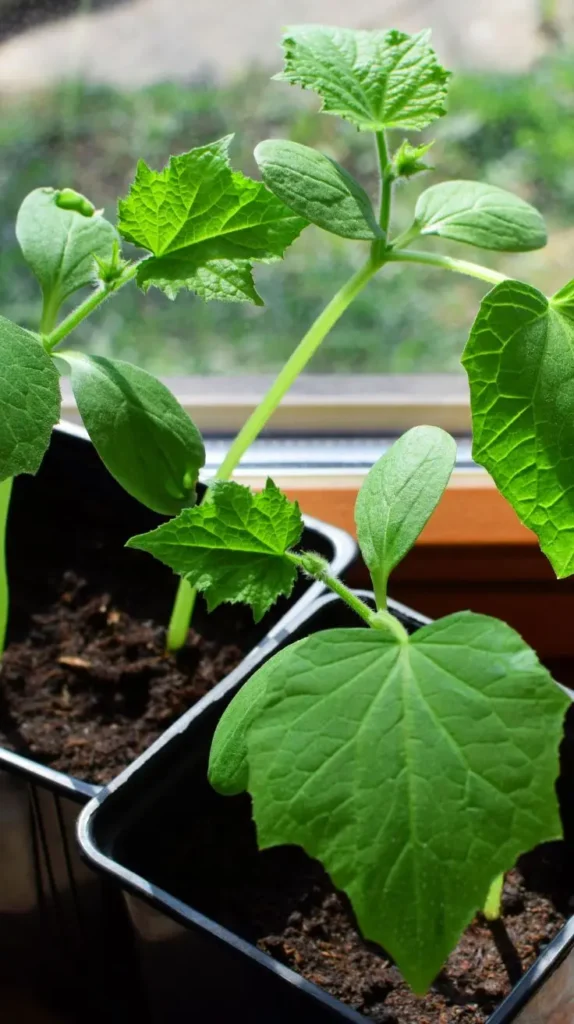 These vibrant young cucumber seedlings are reaching enthusiastically toward the light, displayed in black containers on a wooden windowsill against a soft, bright window backdrop. The leaves are a brilliant, almost fluorescent green, showcasing their distinct textured surface and sharp, classic shape. This scene feels optimistic and fresh, capturing the early stages of growth where every new leaf brings excitement. The placement on the sill is smart, maximizing the essential sunlight these fast-growing vines need. The contrasting texture of the warm wooden sill adds a natural, grounding element. If you want to replicate this, just remember that cucumbers need trellising once they get a bit bigger, so choose a sunny spot that can accommodate a small stake or cage alongside your bucket gardening containers.