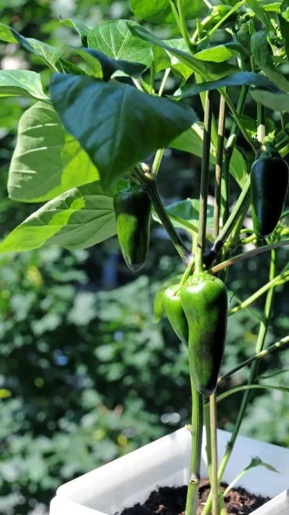 This close-up captures deep green jalapeño peppers hanging from a stout, healthy plant in a crisp white rectangular container. The glossy, dark green fruit contrasts beautifully with the large, matte foliage, suggesting a satisfying, robust harvest. The simple, modern white bucket serves as a clean canvas, making the spicy peppers the undisputed star of the arrangement. This creates a mood that is vibrant and a little bit fiery—it’s the taste of summer heat captured in a single frame. The visual texture of the plant’s strong, dark stem anchored by the bright leaves makes this a very grounding and powerful image. For a similar look, use white or light-colored containers; they not only look clean but can also help keep the plant’s roots cooler in intense sunlight, which peppers adore.