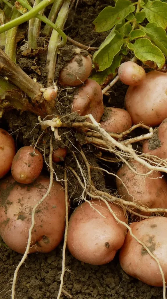 This image shows a truly satisfying harvest: plump red-skinned potatoes unearthed from the dark, rich soil, with their tangled white root systems still attached. The texture of the rough soil clinging to the smooth, slightly pink potatoes creates a wonderfully tactile visual, emphasizing the earthy connection to the food. This scene embodies pure, honest labor and the incredible reward of growing root vegetables. It feels authentic and deeply gratifying. The visual works because of the contrast between the dark soil and the bright, smooth skin of the potatoes, showing exactly where they came from. For successful container potatoes, start with a 5-gallon bucket and continuously add soil, or “hilling,” as the plants grow taller; it’s a simple technique for a big yield!
