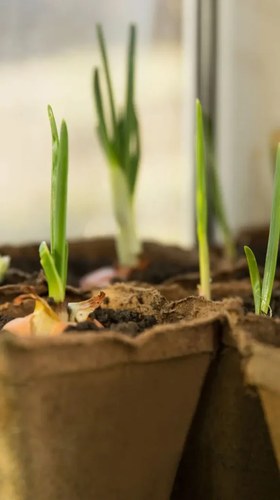 A close-up view shows green onion shoots bursting out of the tops of dark, compostable fiber containers, arranged closely together. The sharp, vibrant green of the new shoots is visually striking against the soft, earthy texture of the fiber pots and dark soil. This is a brilliant example of maximizing small spaces and regrowing scraps. The setup feels resourceful and minimalist, demonstrating how much life can come from a very small container. The overall mood is one of quiet, domestic productivity and natural renewal. To make this work at home, simply place the root ends of store-bought onions in a few inches of moist soil in any small container; you can harvest the greens again and again.