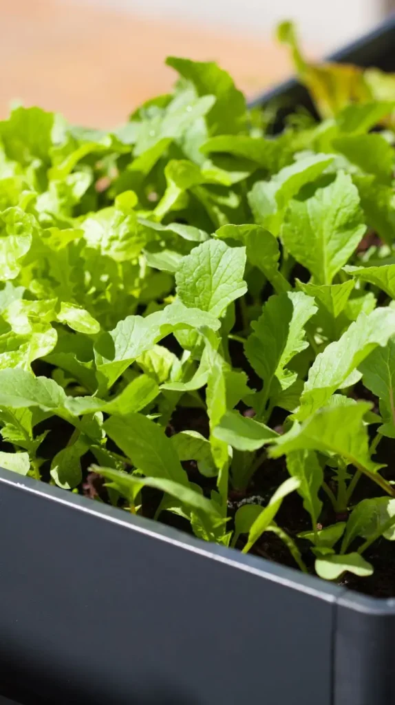 A black rectangular planter is filled to the brim with a riot of bright, varied leafy greens, likely a mix of baby kale, spinach, or lettuce. The leaves exhibit a delightful range of light and dark greens, creating a lush, textured canopy that looks incredibly healthy and ready for harvest. The simple, dark container recedes into the background, focusing all the attention on the vibrant, edible foliage. This conveys a mood of extreme freshness and healthy abundance, perfect for anyone who loves making big, colorful salads. The image feels wonderfully rich and tactile. Try using a rectangular planter like this near your kitchen door for easy snipping; it’s a beautiful and practical way to make your greens accessible.
