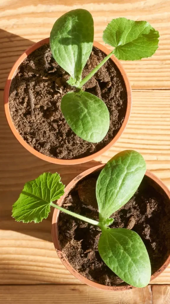 Two adorable young zucchini or squash seedlings are showcased in small, terracotta-colored pots, bathed in warm, dappled sunlight on a wooden surface. The plants have classic, large cotyledon leaves alongside their first true leaves, which are already showing that signature ruffled edge. The warm wood and rich soil against the bright green create a cozy, sunlit aesthetic. This scene captures the tender, early stage of summer vegetables, generating a hopeful and nurturing mood. The simple round pots are a timeless choice that feels instantly familiar and charming. Remember, while they start small, squash plants need a very large container, like a 5-gallon bucket, and lots of room to sprawl once they move past this seedling phase.