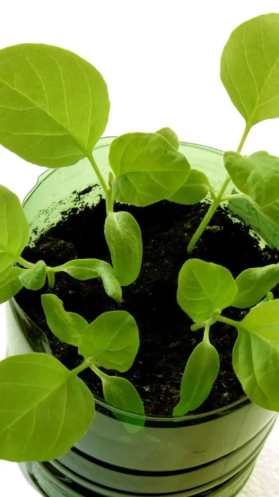 This image shows a collection of vibrant, healthy eggplant or pepper seedlings growing in a recycled, clear green plastic container. The bright, almost neon green of the leaves is stunning against the dark soil, and the repurposed container adds a sustainable, DIY charm to the setup. The small leaves are round and smooth, characteristic of new life. This scene feels very resourceful and hopeful, leaning into the simple satisfaction of recycling everyday items for a new purpose. The bright light filtering through the plastic creates a gentle glow around the leaves. To replicate the budget-friendly spirit, try upcycling containers like old laundry baskets or beverage bottles, just remember to poke plenty of drainage holes in the bottom for successful bucket gardening.
