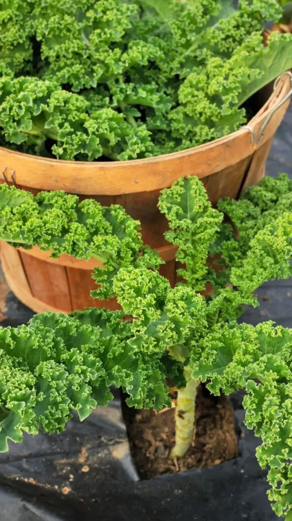 A beautiful, mature kale plant with intensely curly, vibrant green leaves is shown, with a wooden harvest basket resting nearby. The plant’s deep green, crinkly texture is wonderfully detailed and lush, looking robust and ready for a fresh salad. The wooden basket adds a rustic, farmhouse aesthetic that complements the earthy feel of the kale. This image exudes a feeling of nourishment and healthy eating; it’s a picture of pure, satisfying garden goodness. The rich color of the kale foliage signals its high nutrient content. Kale is an amazing choice for bucket gardening because you can continuously harvest the outer leaves without damaging the plant, giving you a steady supply for months.