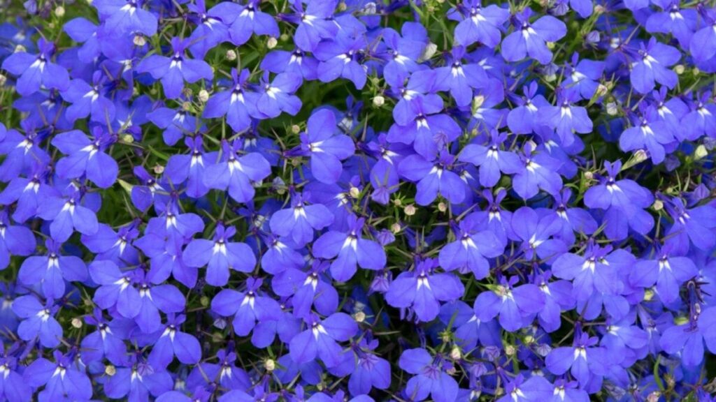 This image shows a breathtaking, dense covering of tiny, electric blue Lobelia flowers, each featuring a small white center for a sparkling effect. The sheer number of tiny blossoms creates a solid mass of color that looks rich and textural, making it an amazing ground cover or “spiller” for a container edge.