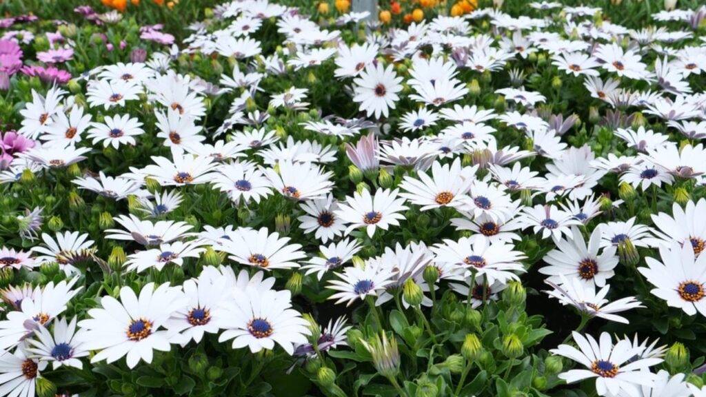Here we see a field of African Daisies (Osteospermum), featuring bright white petals that radiate from a dark, striking center, surrounded by fresh green foliage. The simple, clean shape of the daisy is instantly recognizable and cheerful, and the dark blue-purple center provides an unexpected, modern depth to the classic white flower.