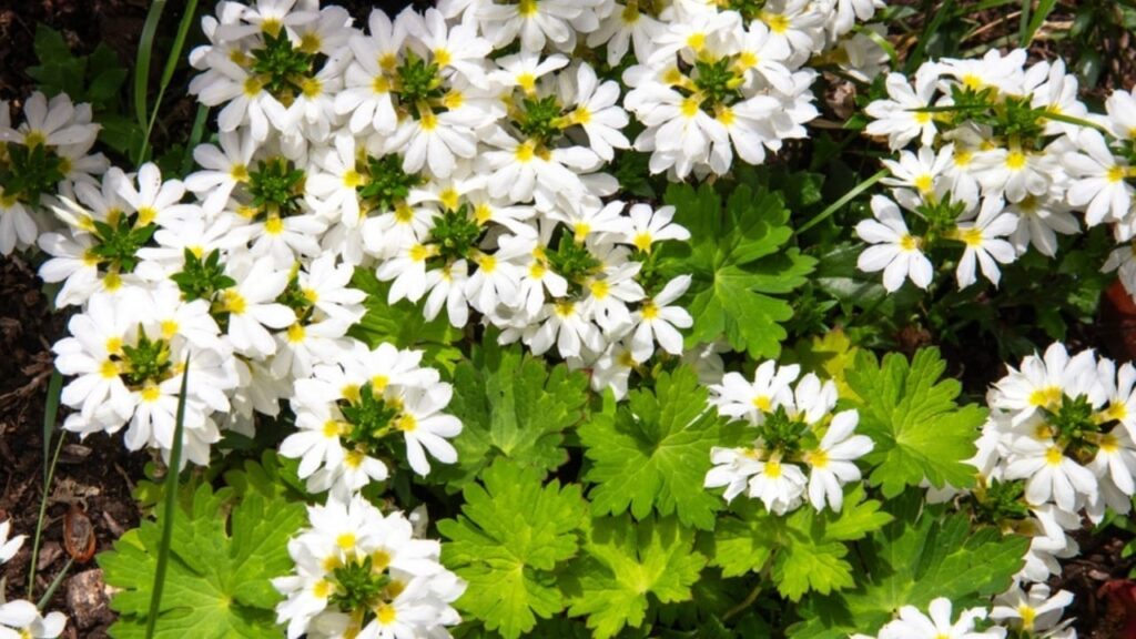 This charming scene features a mass of white Scaevola (Fan Flower) blooms, distinguished by their unique fan shape and a striking bright yellow-green center, nestled amongst deeply lobed, bright green foliage. The flowers form a dense, starry carpet that contrasts beautifully with the interesting, dark-veined leaves beneath.