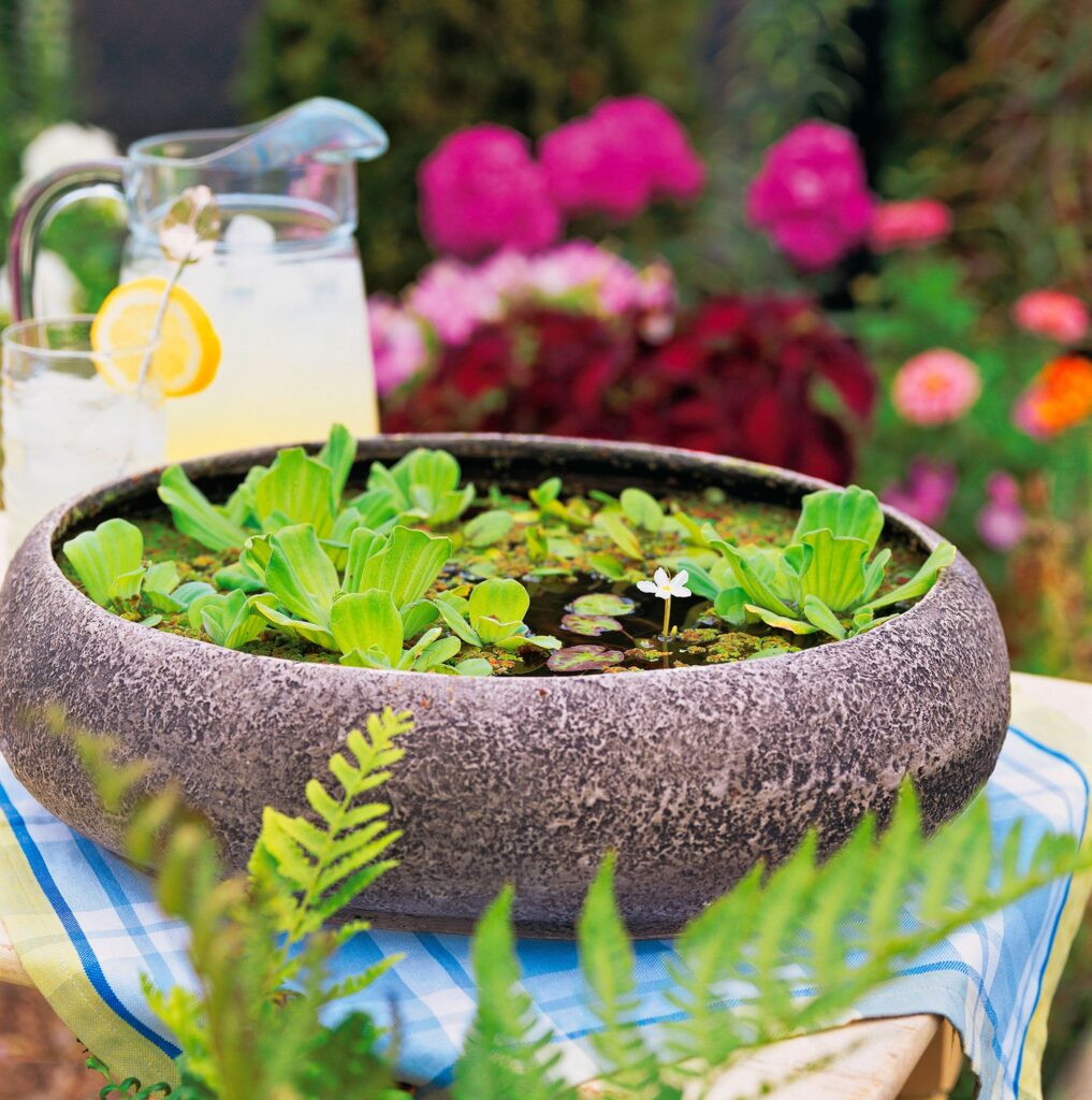 A water garden dish is unique and adds a serene element to your home. Use aquatic plants like water lilies, lotus, and small floating plants.
