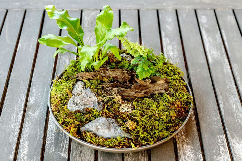 Moss dish gardens are serene and low-maintenance. Use a variety of mosses to create a lush, green landscape.