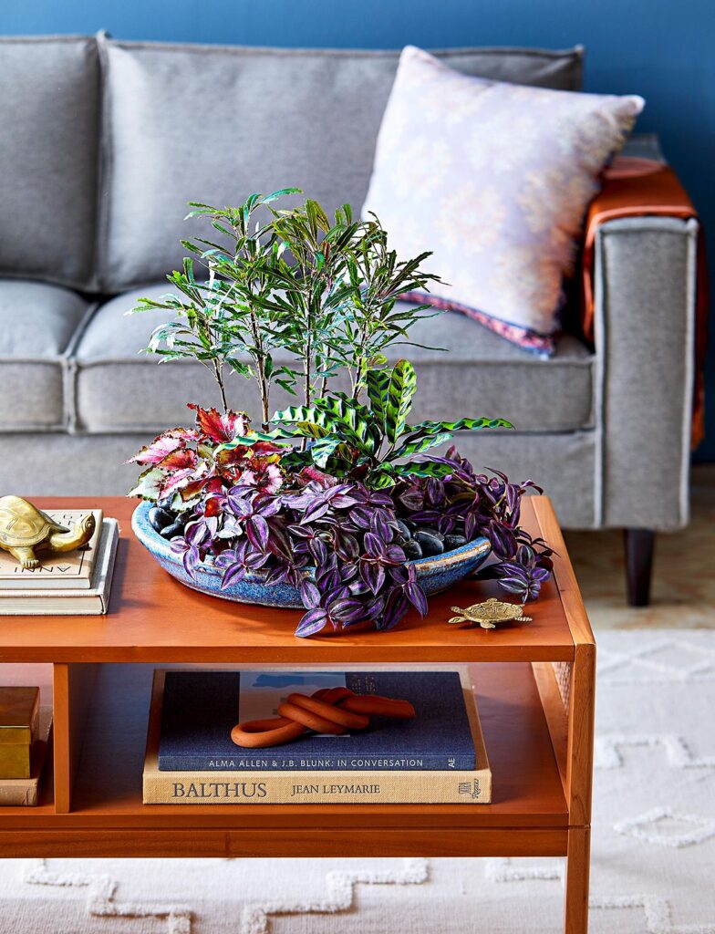Bring a slice of the tropics to your home with a tropical dish garden. Use plants like bromeliads, ferns, and small palms.