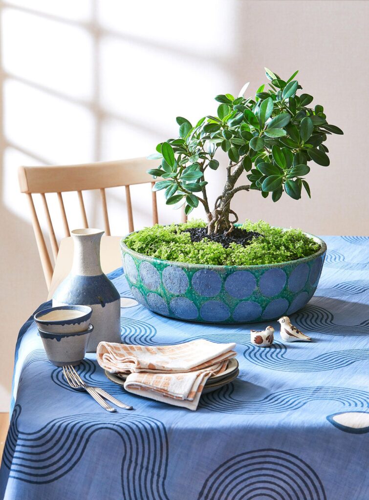 Create a tiny forest with small trees like bonsai or miniature pine trees. Plant them in a shallow dish with well-draining soil.