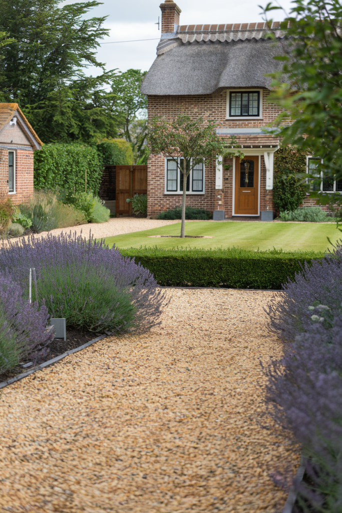 This front garden features a large, sunny, crushed-gravel driveway bordered by neat, low box hedges that separate the stone from a perfectly manicured lawn. Beyond the lawn, a deeper bed is filled with fragrant, mounding lavender, creating a lovely frame for the traditional brick home with its thatched roof.