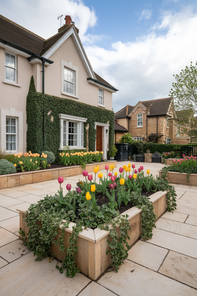The design’s key strength is the dynamic use of height and texture—the rigid stone beds contrast with the soft, flowing ivy and the cheerful, upright tulips. The mass planting of bulbs creates an immediate, intense focal point and a spectacular burst of spring color.