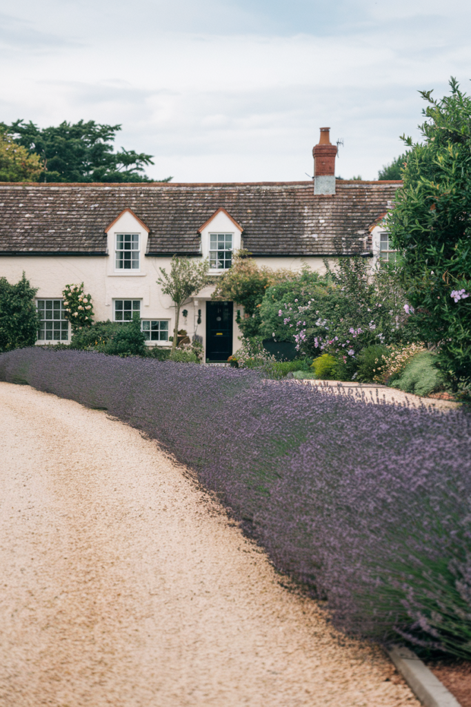 This picture-perfect scene features a light-colored, gravel-chip driveway that curves gently toward a quintessential white cottage. The real showstopper is the dense, unbroken hedge of purple lavender lining the path, creating a beautiful, fragrant border that guides visitors to the front door.
