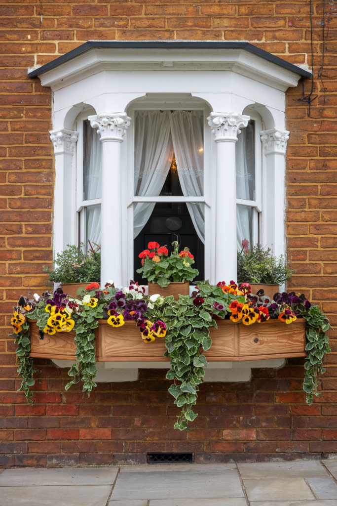 Focusing on a smaller, vertical detail, this image shows a classic wooden window box nestled under a bay window with elegant white columns, set against a warm brick facade. The box is packed with bright flowers—pansies in yellow, purple, and red—with copious amounts of trailing green ivy spilling gracefully over the edges.