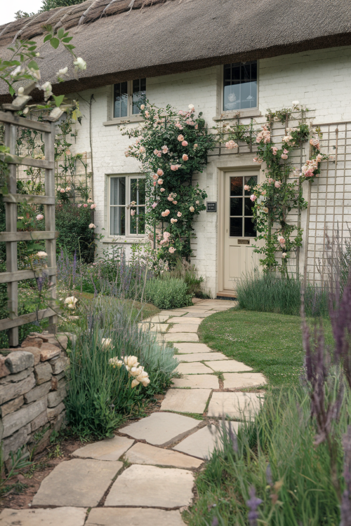 Set against a charming white thatched cottage, this pathway uses irregular, natural flagstones nestled into a green lawn, creating a soft, meandering route to the door. The path is bordered by tall, wispy grasses, lavender, and a low, rustic stone wall, with beautiful climbing roses spilling over a wooden trellis against the house.