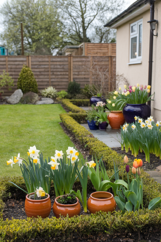 The vibrancy of the design comes from the early-season bulbs and the charming use of small, mismatched terracotta planters placed right at the edge of the border. The structure of the low evergreen hedge and the large colorful pots in the background create strong focal points within the soft greenery.