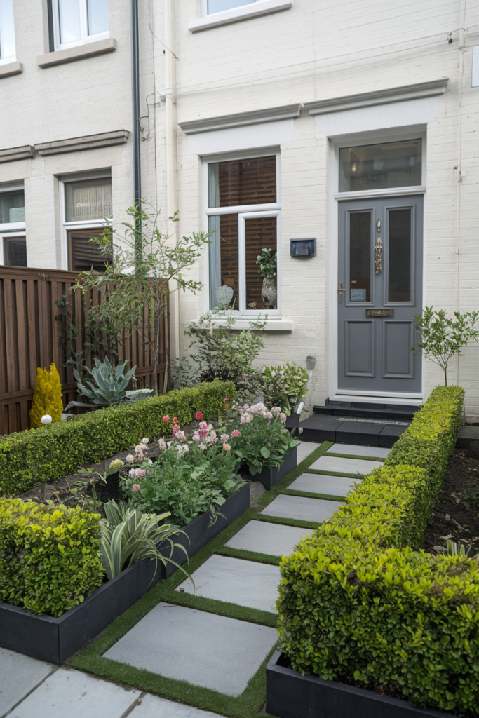 This design features a narrow, urban-friendly front garden with a modern path made of square gray pavers separated by thin strips of artificial or low-cut turf. The path is flanked by low, immaculately clipped box hedges, set into dark, rectangular planters that run parallel to the house.