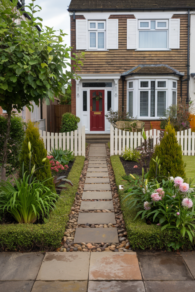 The design is neat, tidy, and visually balanced, using the repeating elements of the stepping stones and the clean hedges to create a sense of order. The white picket fence adds an immediate, classic layer of charm and definition.